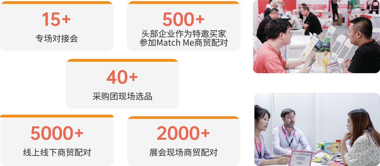 | 2023 SIAL 西雅展(深圳)為 600+ 展商和 500+ 特邀買家提供 Match Me 供需對接服務(wù),通過展位配對、團(tuán)長選品區(qū)、大買家洽談間和對接會(huì)等多種形式為供需雙方成功搭建精準(zhǔn)、高效的貿(mào)易橋梁,現(xiàn)場共完成 5000+ 商貿(mào)配對場次。 |