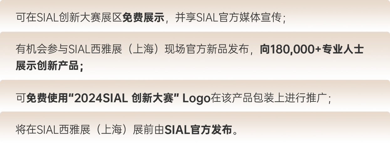 | “2024 SIAL Innovation創(chuàng)新大賽”參賽報名線上通道開放時間延期至4月30日,還未報名參賽的2024 SIAL 西雅國際食品和飲料展覽會(上海)展商,快來報名,抓住向全球展示創(chuàng)新產(chǎn)品的機會!即刻點擊下方“快速報名參賽”按鈕,進入“展商會員中心”后,點擊“上海創(chuàng)新大賽”添加參賽產(chǎn)品信息。 |