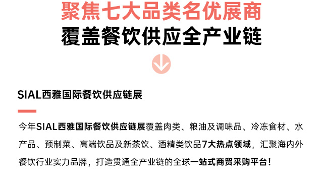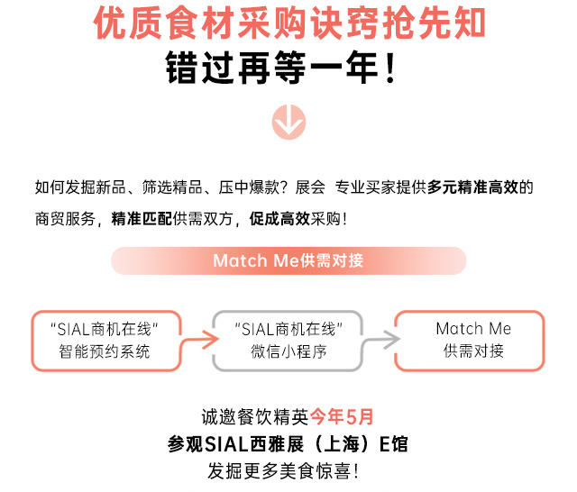 穩(wěn)定可靠的高品質(zhì)食材供應(yīng)鏈,已經(jīng)成為餐企健康發(fā)展的關(guān)鍵支撐。今年SIAL西雅展(上海)將同期舉辦SIAL西雅國(guó)際餐飲供應(yīng)鏈展,屆時(shí)E館將匯聚全球優(yōu)質(zhì)食材,為餐飲人士提供更多采購(gòu)選擇!