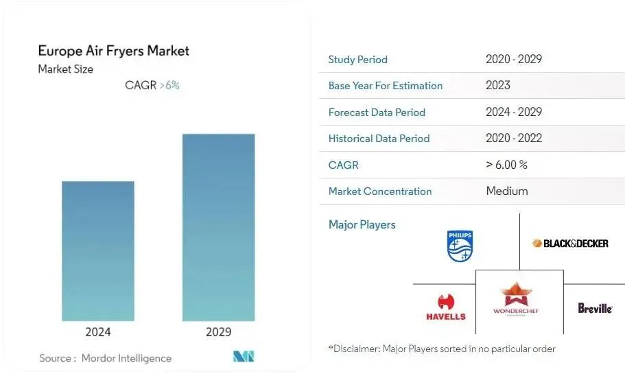 在歐洲情況有些相似。在關(guān)于空氣炸鍋市場(chǎng)規(guī)模的第三份Mordor Intelligence報(bào)告中,分析師指出,歐洲的空氣炸鍋市場(chǎng)今年已創(chuàng)造了7.9679億歐元的收入,預(yù)計(jì)在預(yù)測(cè)期內(nèi)將實(shí)現(xiàn)超過(guò)6%的復(fù)合年增長(zhǎng)率。