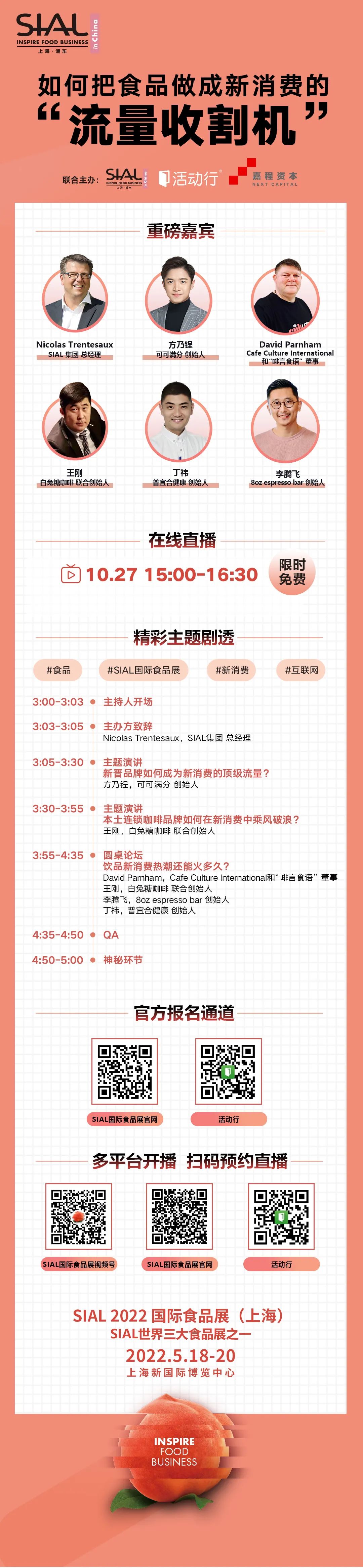 食品新消費千億市值品牌需要新的視野與打法。SIAL自1964年巴黎成立以來一直通過SIAL 在線智庫(SIAL Think Tank)聚集全球最具創(chuàng)新力的食品品牌,為食品行業(yè)帶來前瞻性思考。10月27日(周三)下午3:00-5:00,SIAL在線智庫直播計劃正式開啟,在第一期直播中,來自新消費飲品的新銳品牌高管將分享:如何把食品做成新消費的“流量收割機”: