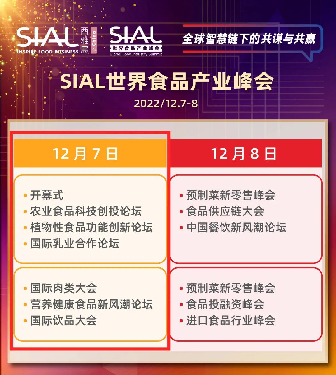 SIAL世界食品產(chǎn)業(yè)峰會(huì)將于2022年12月7日-8日正式舉辦!峰會(huì)將以“全球智慧鏈下的共謀與共贏”為主題舉辦包括預(yù)制菜、供應(yīng)鏈、農(nóng)業(yè)食品科技、乳業(yè)、肉類、飲品、食品投融資、營(yíng)養(yǎng)健康食品、中餐、植物性食品、進(jìn)口食品在內(nèi)的11場(chǎng)主題論壇。
