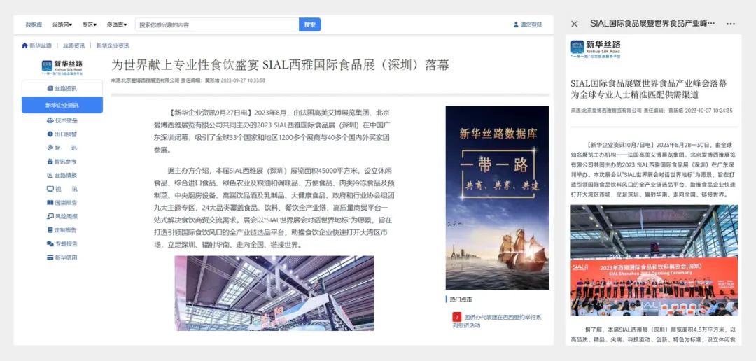 9-10月,“一帶一路”綜合信息服務平臺“新華絲路”資訊板塊接連發(fā)布《SIAL國際食品展暨世界食品產業(yè)峰會落幕 為全球專業(yè)人士精準匹配供需渠道》、《為世界獻上專業(yè)性食飲盛宴 SIAL西雅國際食品展(深圳)落幕》兩篇文章對于2023 SIAL西雅展(深圳)進行報道。